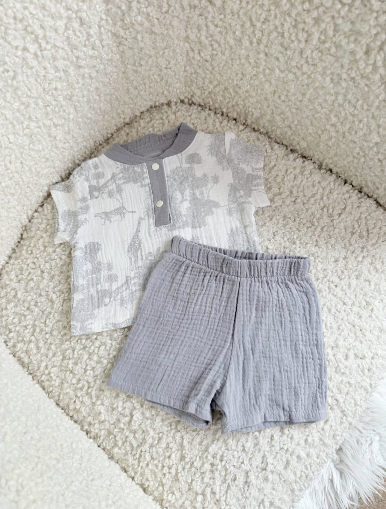 חליפה עשויה מבד מוסלין רך וקליל עם. צבעים רגועים ועיצוב נוח המשלבים סטייל עם נוחות לאורך כל היום ✨.