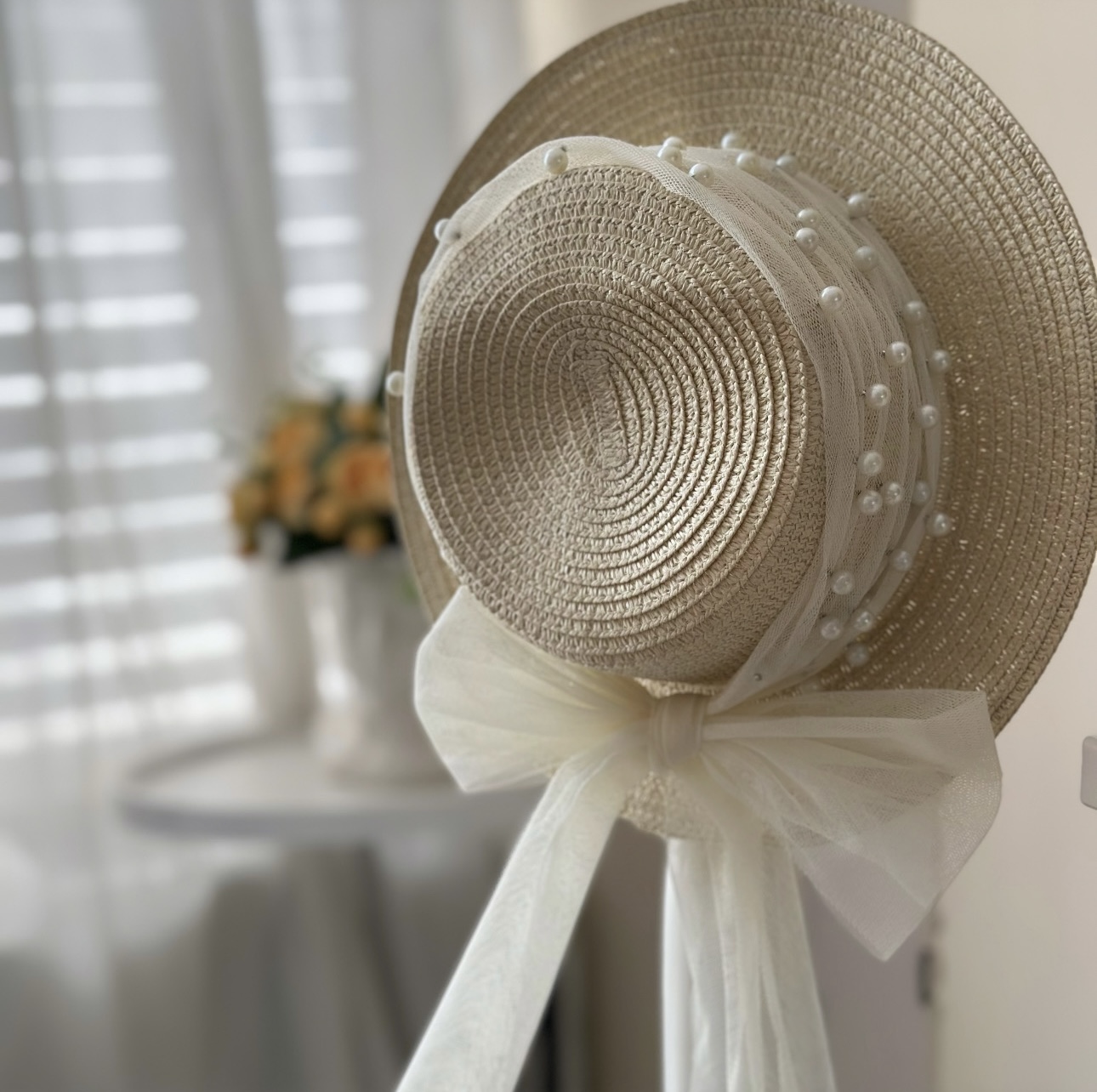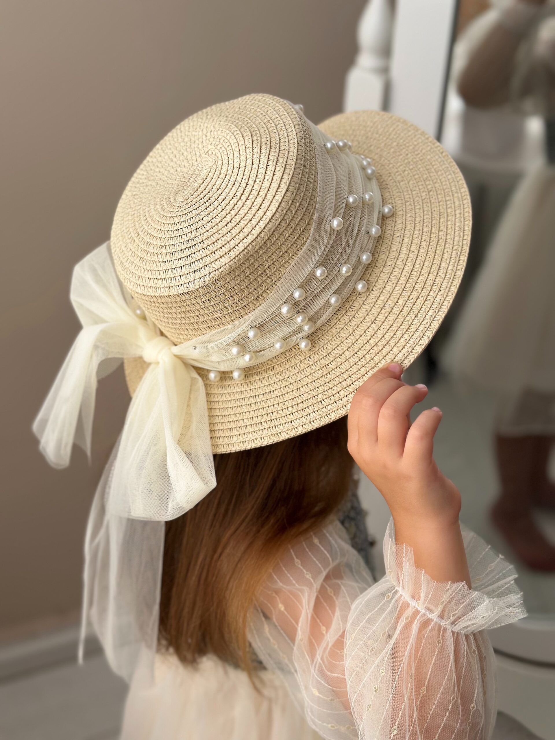 כובע קש עם סרט ופנינים נשלפים – מתאים מגיל שנתיים ומוסיף אלגנטיות לכל מראה.