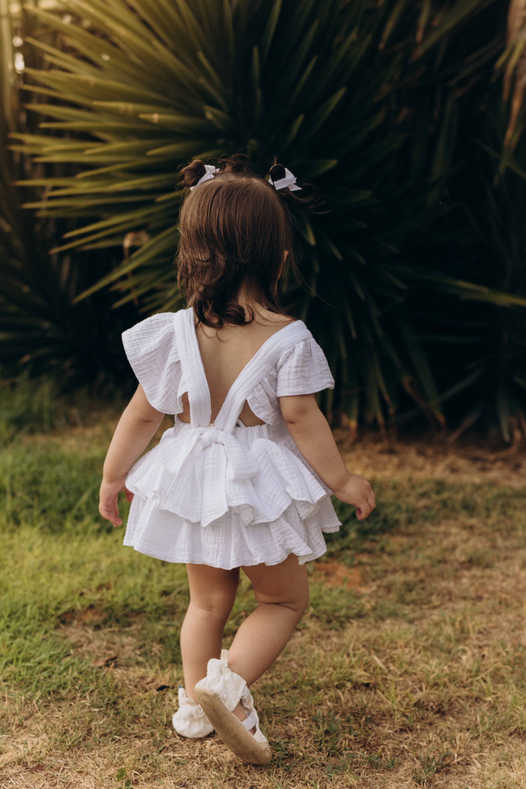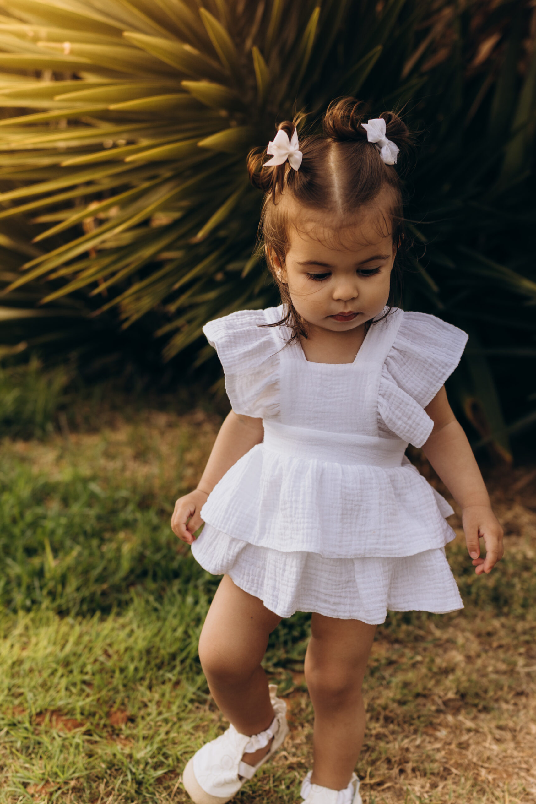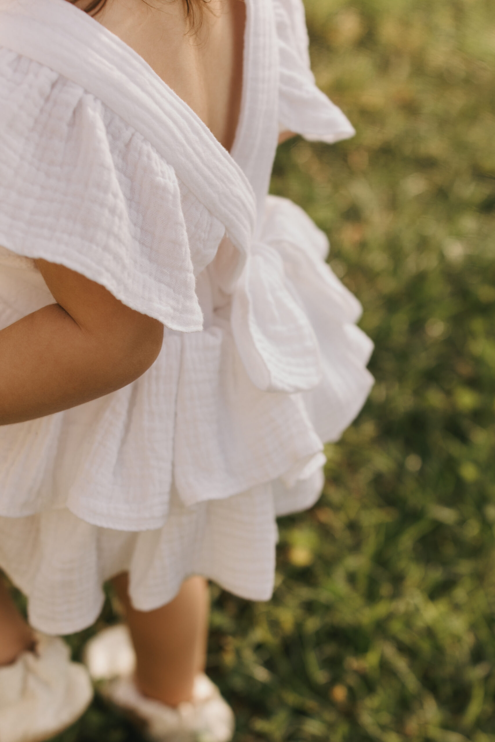 שמלת מוסלין לבנה עם מראה נקי וטהור. לוק מלא רוך ושיק קייצי מושלם.