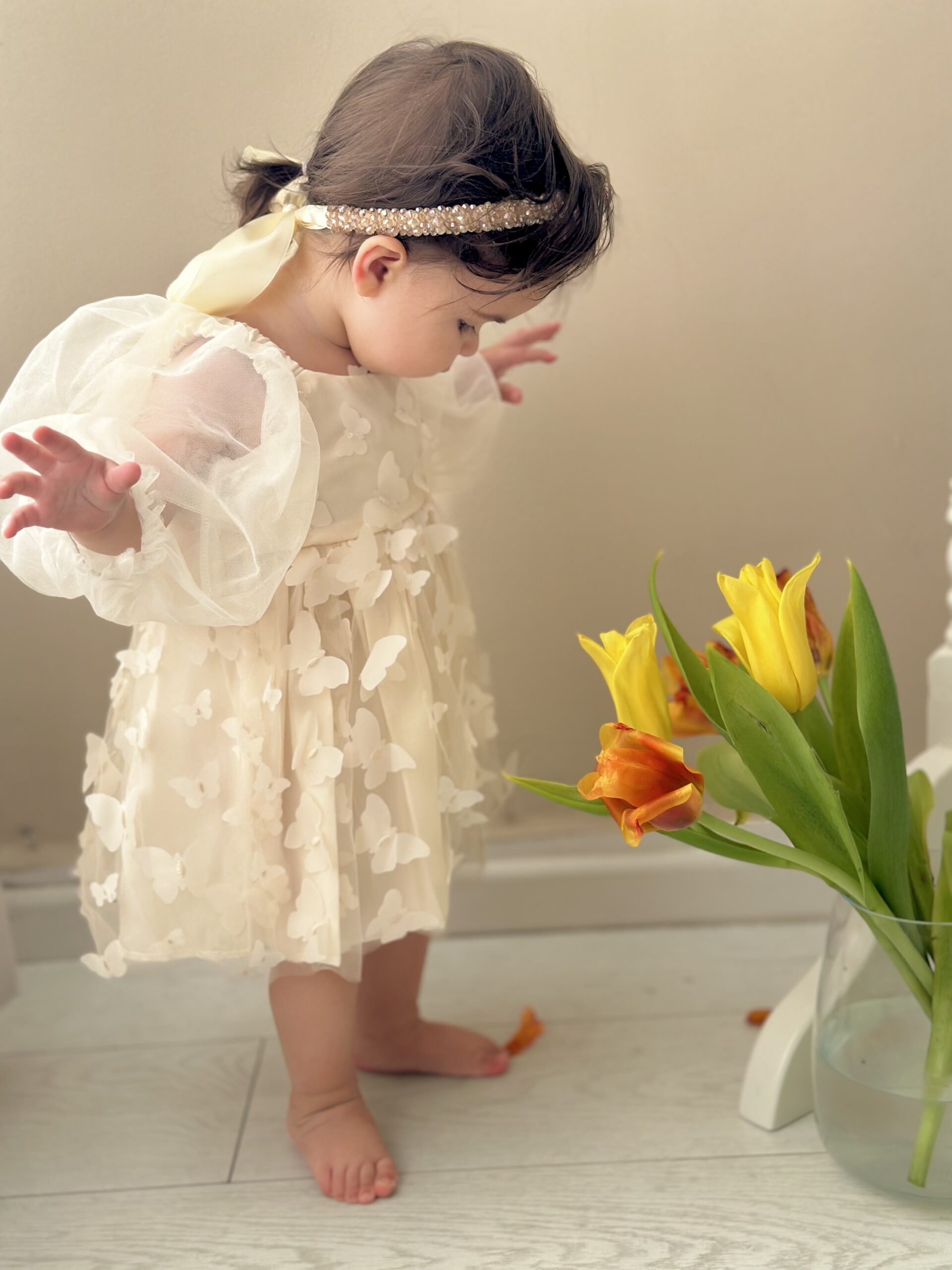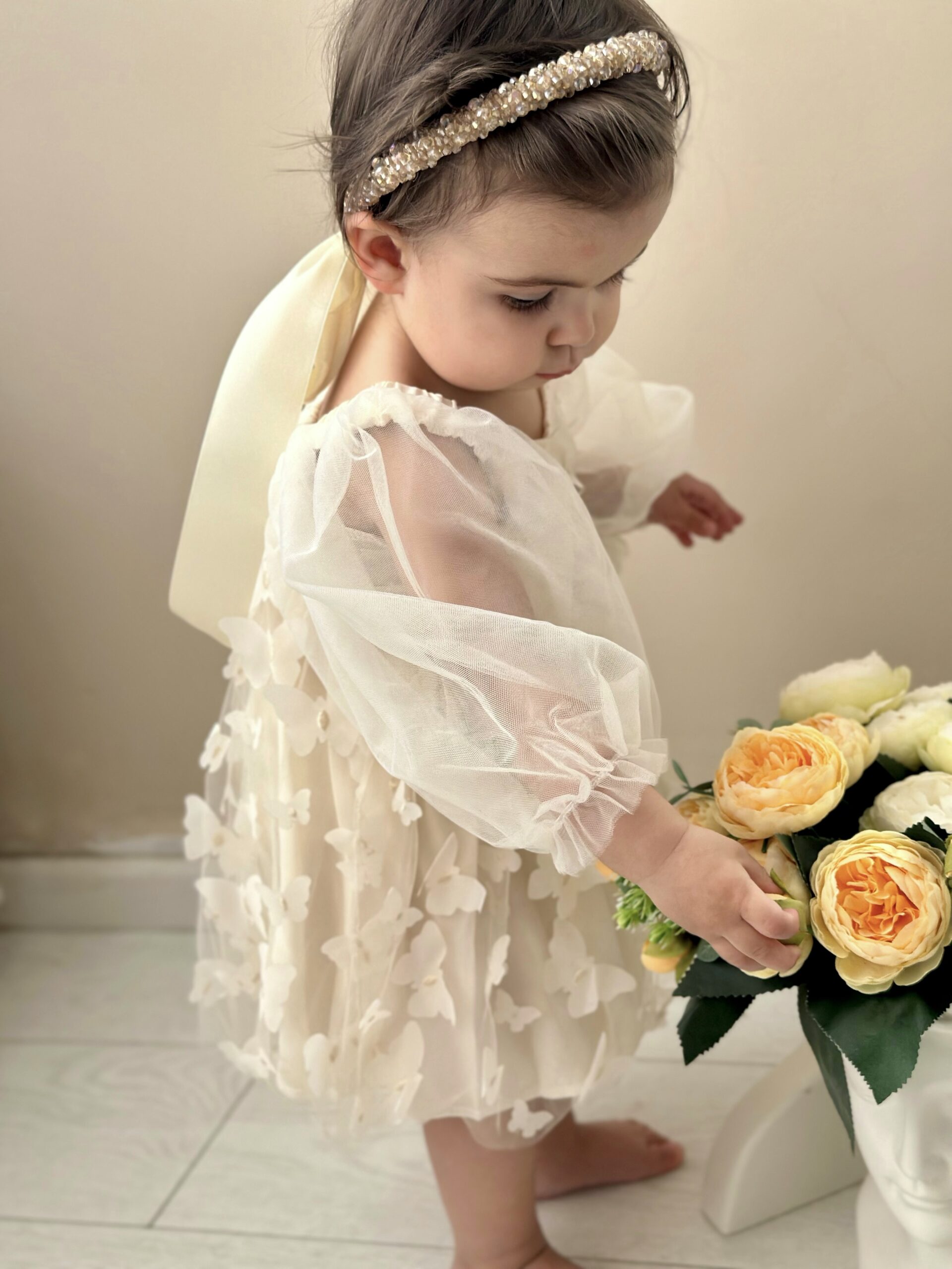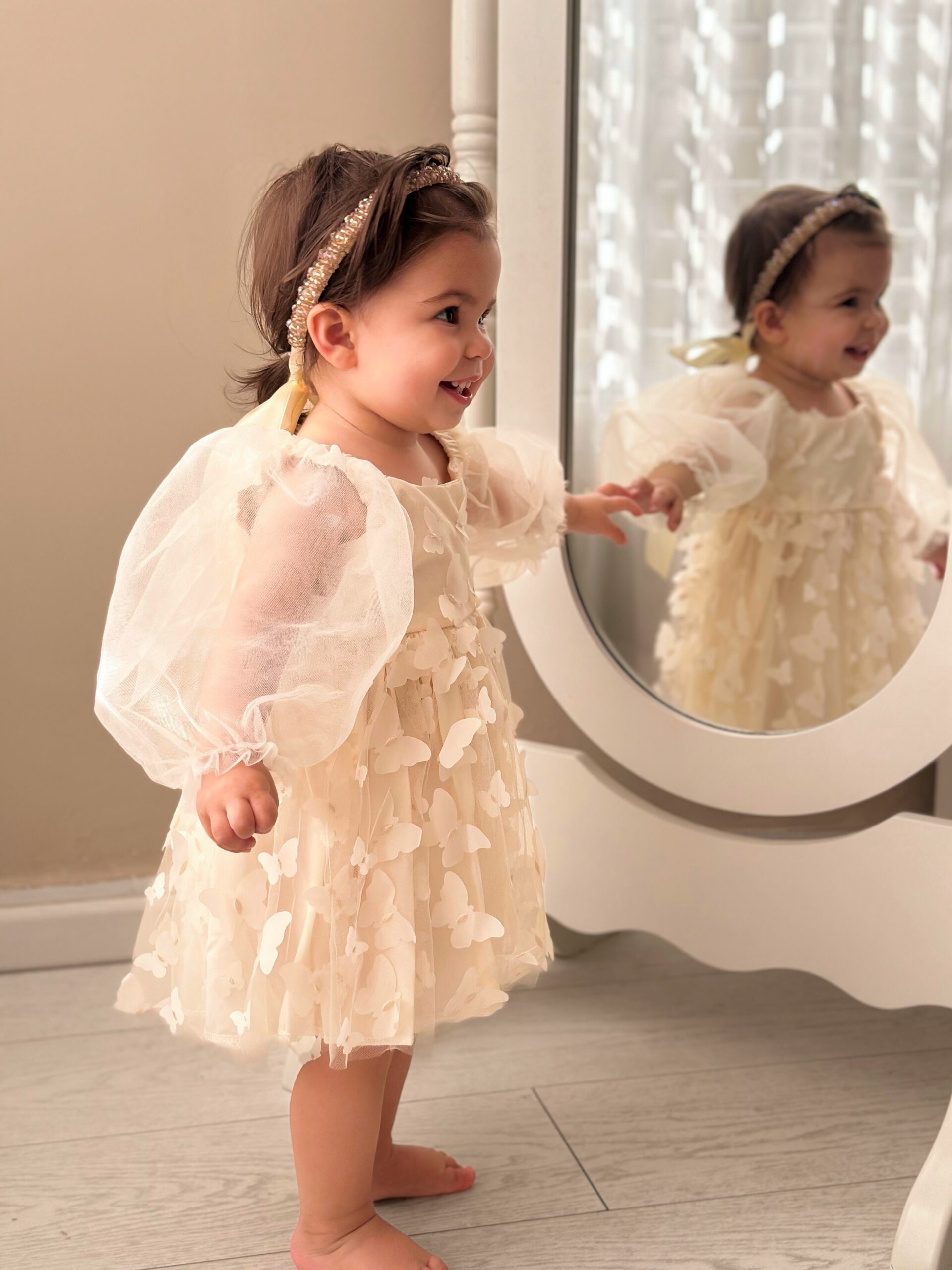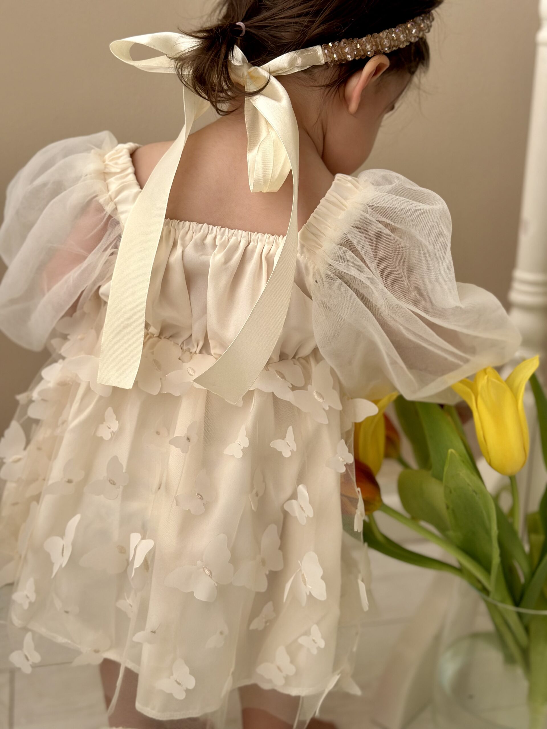 🎀 שמלת נסיכות עם שרוולים נפוחים ופרפרים עדינים – כמו מתוך אגדה מתוקה.